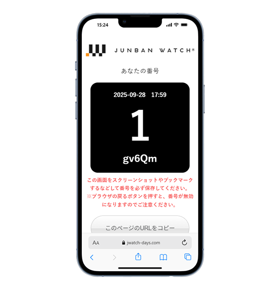 QRコードを読み込み番号発行ボタンを押すと、お客様の番号とIDが入った画面が表示されるので、それを整理券の代わりにします。個人情報は一切取得せずに画面にオンリーワンの整理券を表示できるのが特徴です。